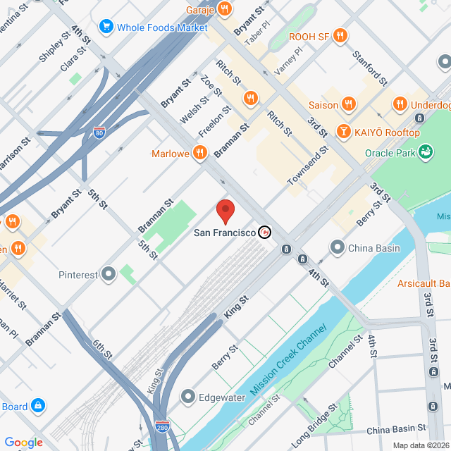 Parking: Bluxome St (between 4th and 5th). Walk around to the front of the building on 4th street, take a right at Walgreens down Townsend towards 5th street.